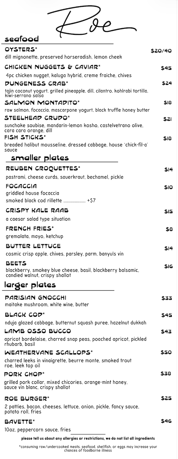 Our menu changes with the seasons and with the Chef’s continuously evolving inspiration. Below you'll find a sample of our seasonal menu—a snapshot of what's inspiring us right now. But like all good things in life, it's always in flux. A dish you fall in love with today might evolve into something new next week, which is exactly what makes dining here an adventure worth repeating.